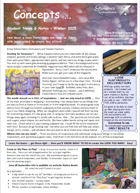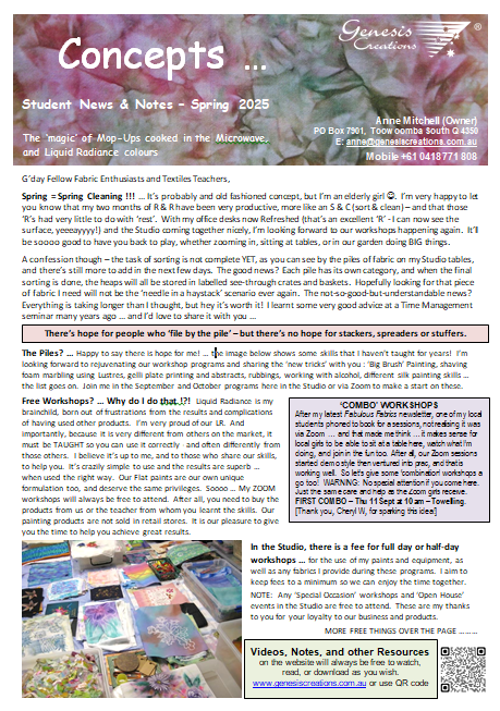 Make sure you are in my email contacts lists to receive this mailing - a very different style of newsletter from Concepts. The email goes out to a very large mailing list of contacts built up over many years - from meeting people at shows, catching up via advertising, and personal contacts from my many workshop programs. If you have a sensitive spam filter, you MAY need to look for me in your Junk mailbox, or add me to your Safe Senders list.